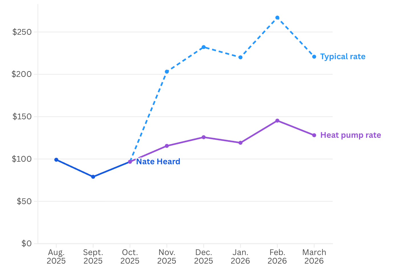 Para Nate Heard, que calienta su casa de cinco habitaciones con bombas de calor, los ahorros por kilovatio-hora han sido significativos.